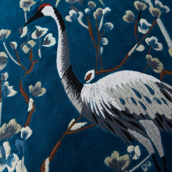 Immerse yourself in the serene beauty of nature with our scenic lagoon design cushion, where cranes and foliage seamlessly merge on a luxe velvet base with a sophisticated fringed edge. Crafted from durable polyester fibres with a sumptuously soft velvet finish and a feather filling for ultimate plushness. Perfectly coordinated with our matching bedding, it pairs effortlessly with the Burford curtains and throw in the same colour velvet.
